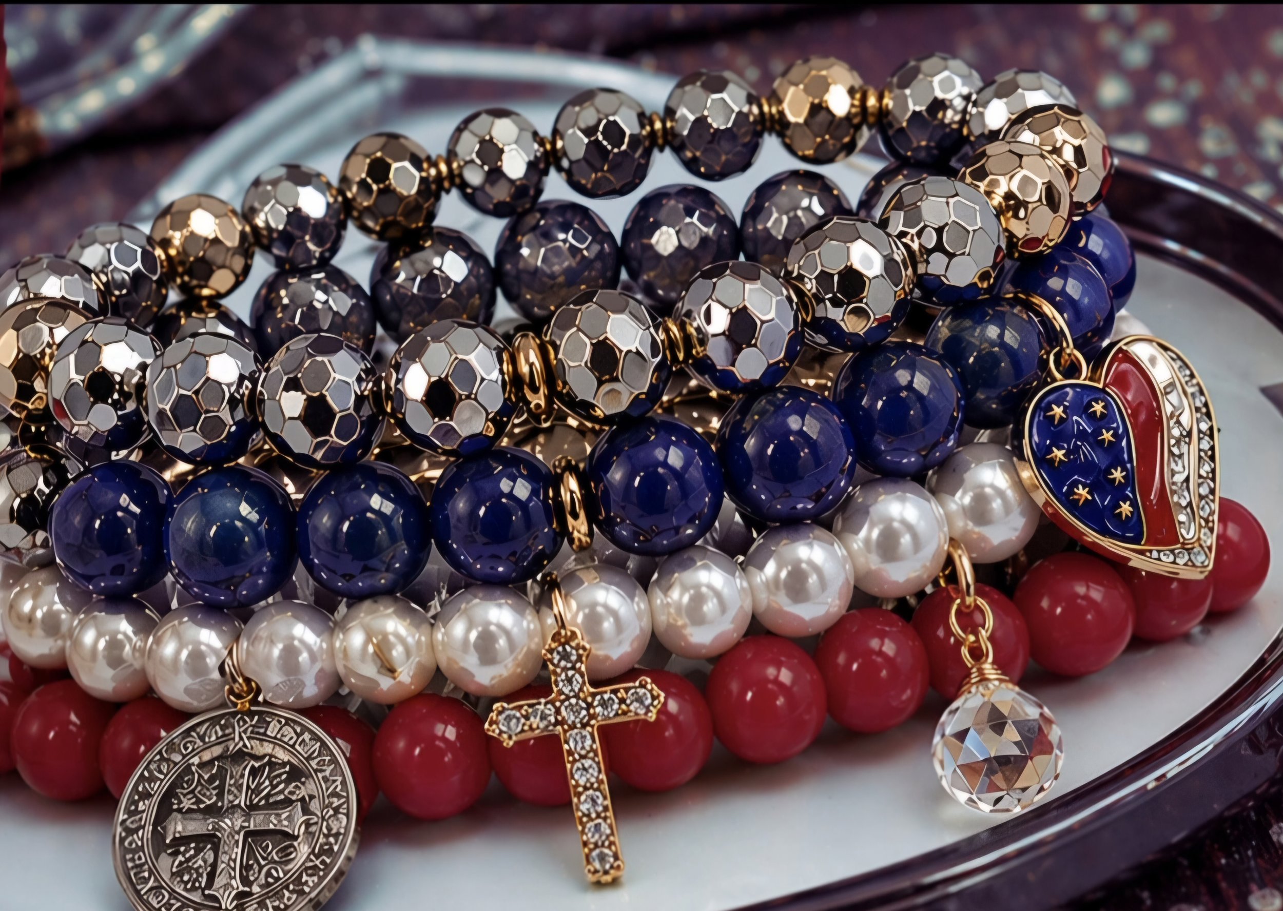 Crafted with mixed gold and silver hematite, rich blue lapis lazuli, luminous mother of pearl, and bold red jade—stones long regarded for protection, courage, and resilient strength.